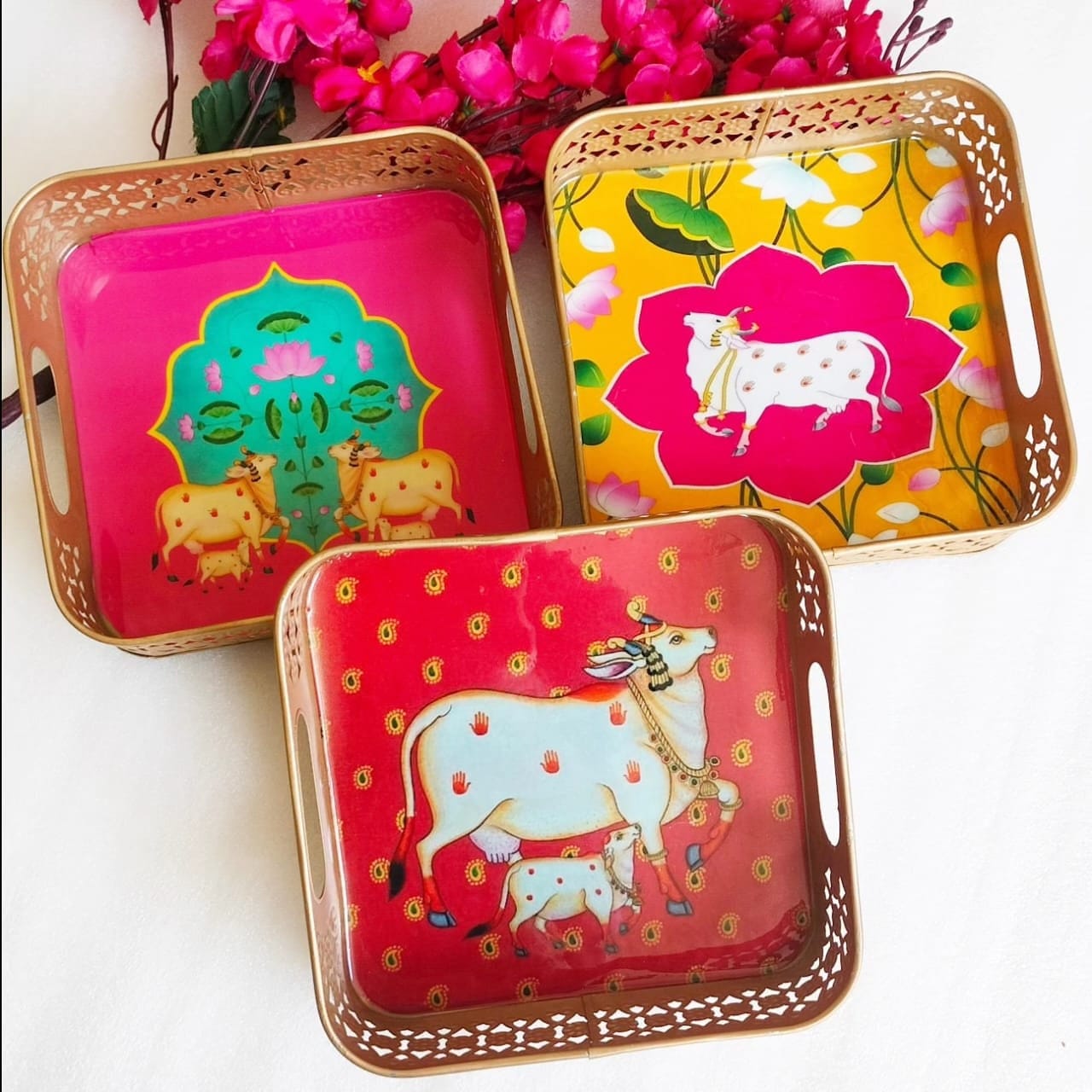 Pichwai metal meenakari trays for festival Diwali, Navratri, Pooja, Wedding return gifting 🎁 and favours (6 inch width)